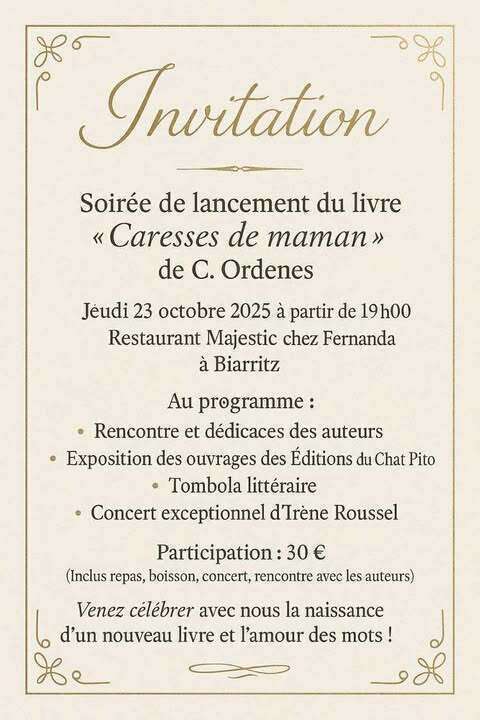 Une belle soirée d'auteurs et de musique ! J'aurai le plaisir de vous y accueillir au sein des Editions du ChatPito pour vous présenter mon livre Le chant du Coeur avec dédicaces personnalisées.